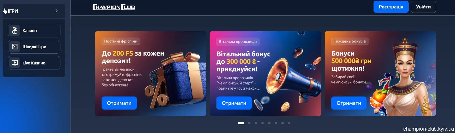 Казино Champion Club пропонує своїм користувачам цілу систему бонусів і спеціальних акцій, які роблять гру не тільки захопливою, але й максимально вигідною. Українські гравці отримують можливість почати свій шлях у казино з додатковими привілеями, а також користуватися постійними пропозиціями для підтримки інтересу.