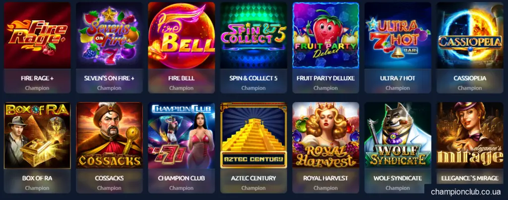 Онлайн-слоти складають основу каталогу Champion Club. Тут представлені: