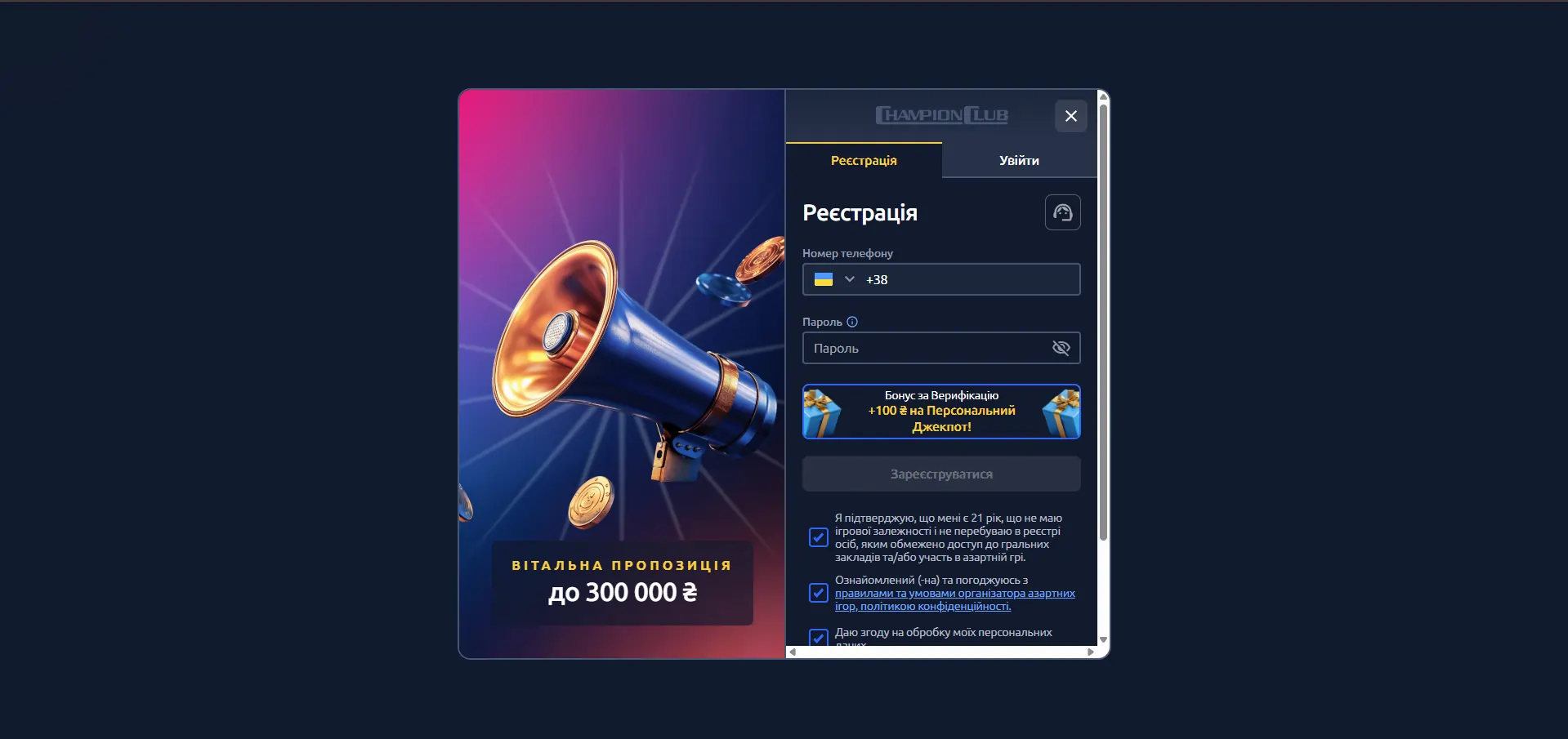 Процес Реєстрації в Чемпіон Клуб розроблений максимально зручним для українських користувачів і займає не більше кількох хвилин. Наявність особистого акаунта дозволяє запускати будь-які ігрові автомати, брати участь у турнірах, активувати бонуси та здійснювати фінансові операції у гривнях.
